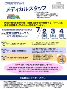 このほか、病院で働く15職種と患者会で組織する「チーム医療推進協議会」からは、みなさまに「チーム医療」やチームのメンバーの役割や仕事内容を知って頂きたく、ポスター発表をいたします。