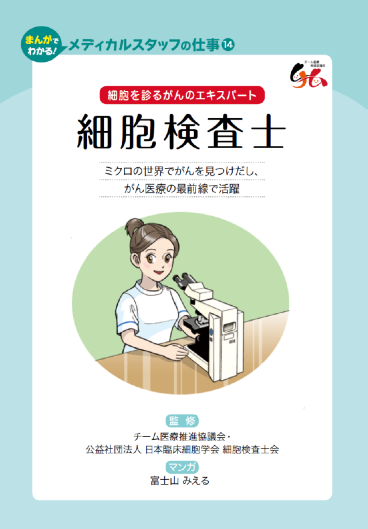 チーム医療推進協議会では、メディカルスタッフの仕事を知っていただく為に様々な活動をしてきました。この度、その一つとして「まんがでわかるメディカルスタッフの仕事」第14弾「細胞検査士」を作成しました。