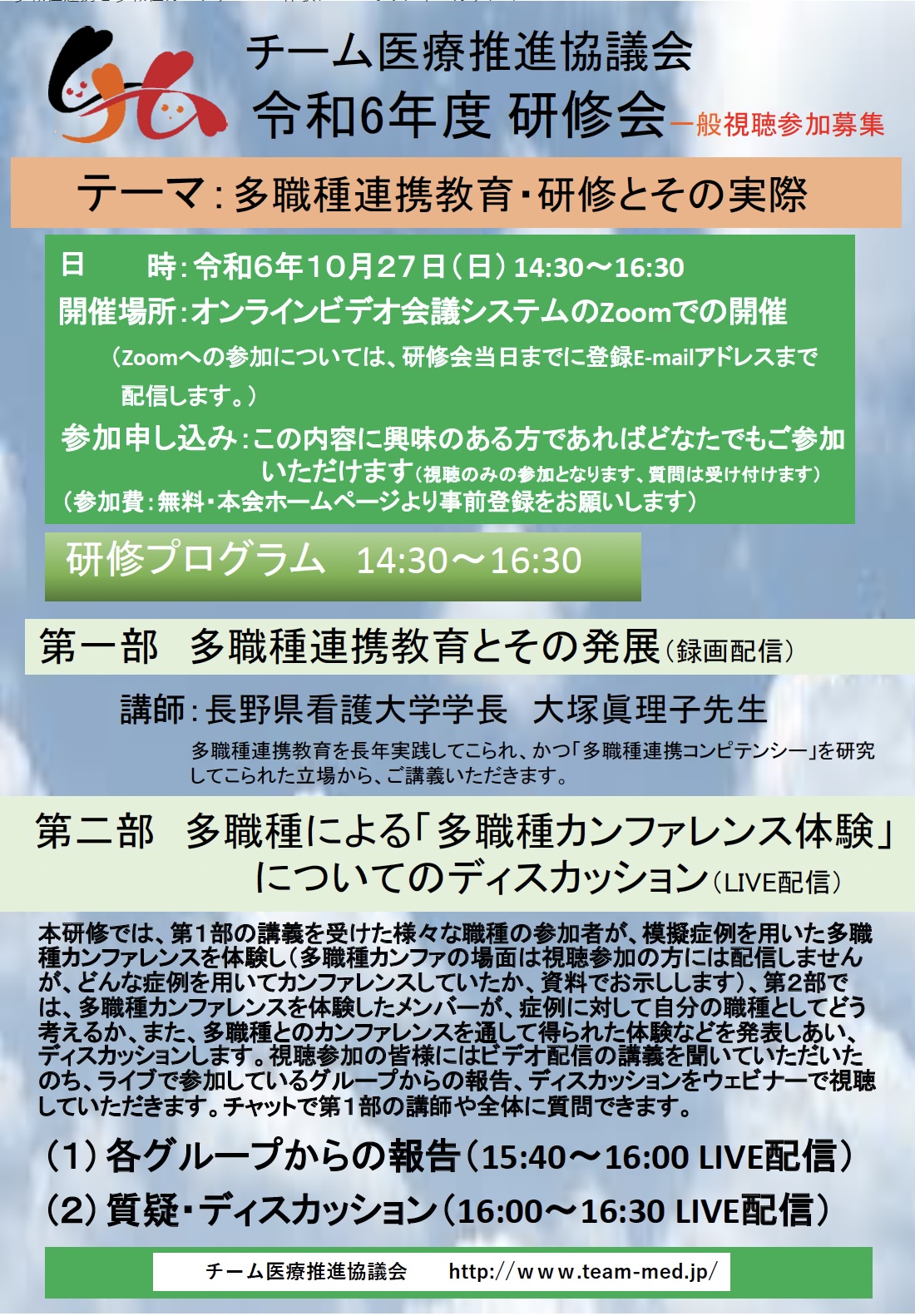 今年度のチーム医療推進協議会の研修会は、テーマ「多職種連携教育・研修とその実際」と題して開催いたします。